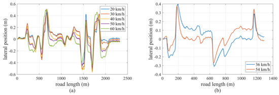 The simulation results of the vehicle’s lateral position of the proposed driver model on the two test roads are shown in Figure 12. The lateral position of the vehicle is defined as the distance (lateral deviation) between the vehicle’s current trajectory point and the virtual lane centerline; the value is positive if the vehicle is on the right side and negative if the vehicle is on the left side. On both test roads, all the lateral positions of the vehicle under different speeds varied in a certain range of to m, indicating that the vehicle was controlled to drive within the lane all of the time. Further, there was no risk of collision with vehicles on other lanes, and the driving safety can be guaranteed when the model is applied to vehicle lateral control. Thus, the simulation results demonstrated that the proposed human-like driver model had the basic ability of following and negotiating curved roads.
