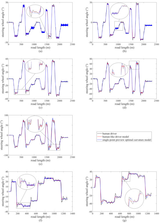 The steering wheel angles of the human driver and the two models were put together for comparison, as shown in Figure 13. Among them, (a)–(e) show the comparison of the steering wheel angles under the six speeds on the original test road and (f) and (g) show the comparison of the steering wheel angles under the other two speeds on the new test road. Overall, the steering wheel angles of the two models had a consistent variation tendency with the human driving data. The steering wheel angle values of the three basically coincided, as would be expected as well. Indeed, the shape of the steering wheel angle corresponded to that of the road curvature; because of the understeering characteristics, the amplitude of the steering wheel angle increases with the vehicle speed.