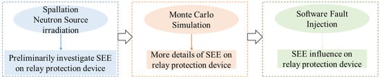 As mentioned above, there can be a lack of outcomes in relay protection SEE assessment. To address this issue, considering the operations of CSNS, we proposed a research framework that combined spallation neutron source irradiation testing, Monte Carlo simulations, and software fault injection to assess SEE influence on relay protection devices. Figure 2 shows the framework of the current study in which the irradiation test checked whether the atmospheric neutron could induce SEE on relay protection. Then, the Monte Carlo simulation provided details about SEE, such as the distribution of multi bit upsets. At the same time, the Monte Carlo simulation also provides the upset information during software fault injection.