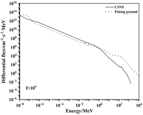 In the simulation, a 32 × 32 array of sensitive volumes was positioned, with each sensitive volume measuring 160 nm × 160 nm × 160 nm in size. The critical charge was 3820 eV. A total of 108 impinging neutrons were generated from a planar source with a size of 10,080 nm × 10,080 nm. The neutron spectrum was derived from the terminal of the China Spallation Neutron Source, as depicted in Figure 4. It can be observed that the neutron spectrum at the CSNS terminal was similar to the spectrum at ground level in Beijing, but with an amplification factor of 109 from its actual fluence.
