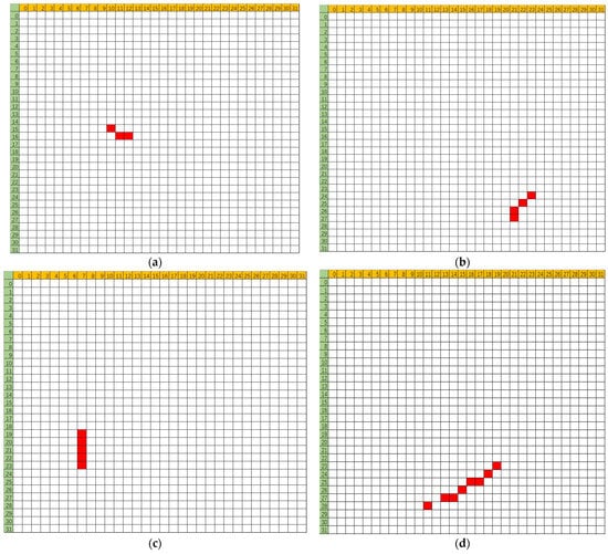 According to flipping cell coordinates, the specific distributions of these multi bit upset events could also be extracted. Figure 5 represents the flipping bit distribution schematic diagrams of a part of multi bit upset events, including three bits in (a), four bits in (b), five bits in (c), and eight bits in (d).