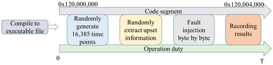 During the execution of each test program in Linux, faults were injected into the corresponding code segment. The code segment’s address ranged from 0x120,000,000 to 0x120,004,000, totaling 16,385 bytes. The details of the fault injection process were as follows, and Figure 8 depicts a diagram illustrating the fault injection.