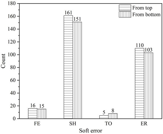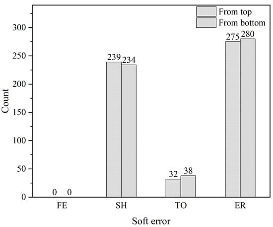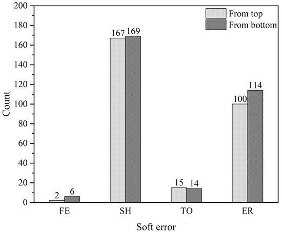 From the obtained results in Table 2 and Table 3, it can be observed that neutrons striking from the top or bottom of the chip can result in multiple types of SEU. Further, the cross section for the first case was 2.42 × 10−15 cm2⋅bit−1 while for the second case was 2.35 × 10−15 cm2⋅bit−1. These are close to the results obtained in spallation neutron source irradiation on similar technology memory. In the irradiation test, the SEE cross section was 1.50 × 10−15 cm2⋅bit−1 [37]. It demonstrates that the Monte Carlo simulation and the fault injection results are credible. Meanwhile, the soft error rate for them at Beijing ground (9.5 n/(cm2·h)) were 22.99 and 22.33 FIT/Mbit when neutrons struck from top and bottom, respectively. These indicate that the SEE sensitivity of relay protection devices are almost close whether a neutron hits from the top or bottom.