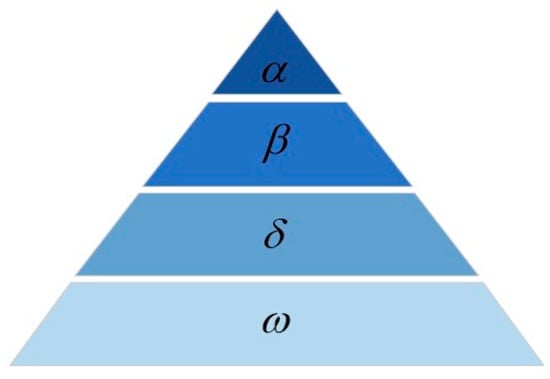 The GWO algorithm is a swarm intelligence (SI) algorithm and has received extensive attention in recent years []. The structure of the traditional GWO is shown in Figure 1. The traditional GWO divides wolves into four ranks based on their social status and responsibilities: , , , and wolf. The wolf is first-rank, and primarily makes decisions in the hunt. The wolf dominates all other wolves and has the best information about the location of its prey. The wolf is second-rank, and helps the wolf to make decisions. The wolf follows the wolf and can command other lower-rank wolves. The wolf is third-rank. The rest are wolves, belonging to the fourth rank, which is the lowest rank. The predation process has two steps. The first step is to surround the prey. The second step is to attack the prey. The model for surrounding the prey is shown by Formulas (1) and (2):