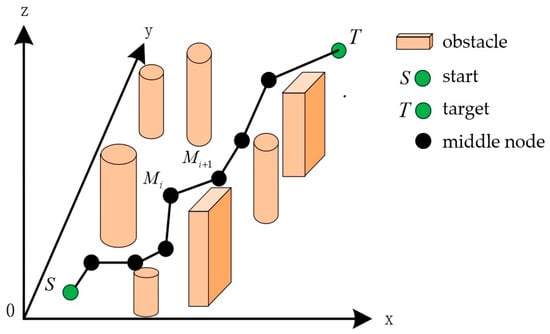 In the flight mission of a UAV, the limitation of energy and battery capacity is a key factor, which directly affects the flight time and flight range of the UAV []. Therefore, the flight distance of the UAV is limited, and the shortest path that satisfies the constraints should be selected. As shown in Figure 3, if there are intermediate nodes in a path, the path is divided into segments. The current node coordinate is . The path distance cost function is shown in Equation (26):