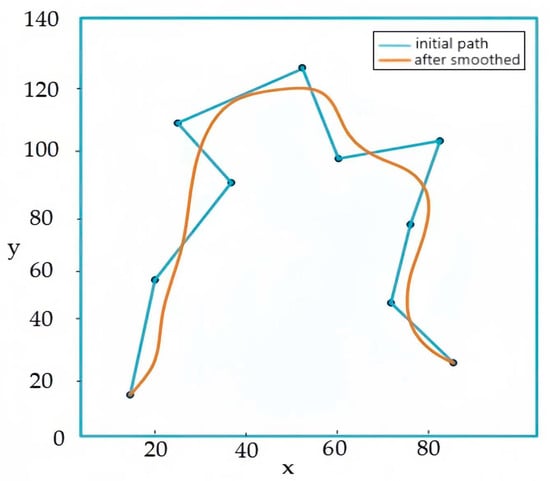 In order to ensure the feasibility and smoothness of the path, the B-spline curve strategy is introduced as shown in Figure 4 []. This curve is an interpolation curve, usually used to fit data or generate smooth curves, which can quickly calculate local curve segments without recalculating the entire curve. B-spline converts a given control point into a set of parameters and uses these parameters to calculate points on the curve. The B-spline curve is defined as shown in Formula (35):