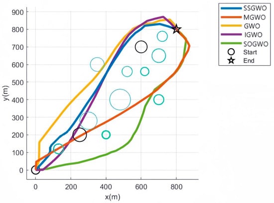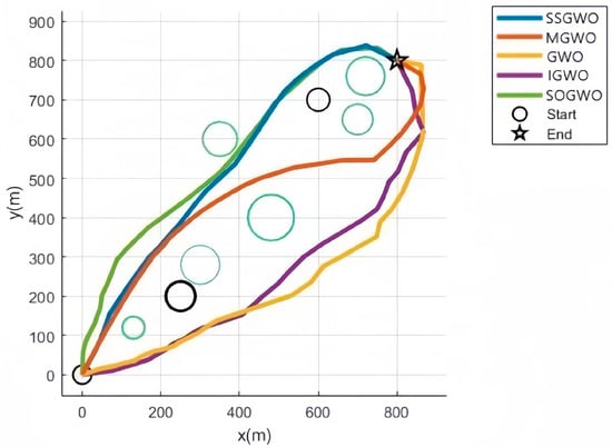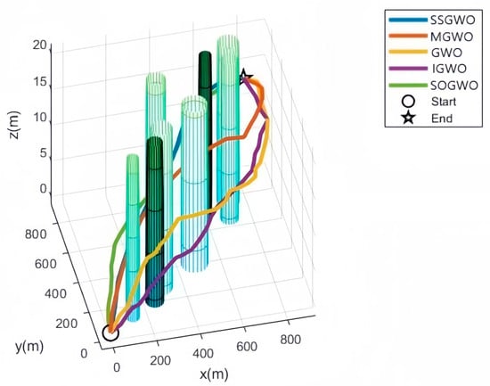 As shown in Figure 5, Figure 6, Figure 7 and Figure 8, these five algorithms can effectively find feasible solutions. This fact fully proves that these algorithms have extremely high practical value for practical applications. Compared with traditional mathematical methods, these metaheuristic algorithms show more outstanding practicability in problem solving. They can effectively overcome diversity and uncertainty in complex problems. In terms of optimal results, GWO and the four GWO variants showed different performance. In terms of performance, the GWO algorithm showed relatively weak performance, mainly because it is highly dependent on the first three wolves in the optimization process, which often causes the algorithm to quickly fall into a local optimal solution. The path planned by GWO is the farthest from the obstacle, but the path is too long and is less helpful for practical applications. SSGWO has higher convergence accuracy and stability than the other algorithms. The path found by the SSWGO algorithm is better than for the other four algorithms. Although it is the closest to the obstacle, it ensures the shortest path and also meets the safe distance requirement. The minimum path distance and the average path distance are both optimal values, and in the 50 optimization processes the number of collisions was 0. The path length for SOGWO is shorter, but the planned path has too many inflection points, which affects navigation efficiency and is not conducive to the applications of UAVs.