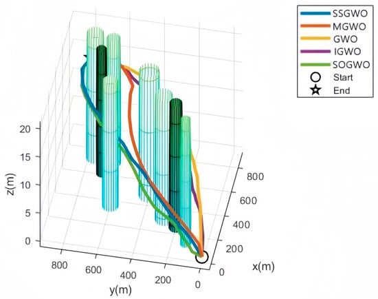 In complex environments with multiple constraints, the path planned by the SSGWO algorithm not only appears to be the shortest, but also maintains the highest level of smoothness. By observing the five algorithms in Figure 9 and Figure 10, it can be clearly seen that, as the complexity of the environment increases, only the paths planned by the two algorithms SOGWO and SSGWO show greater feasibility. In 50 experiments, the number of collisions with the SSGWO algorithm was zero, which means that its planned path is not only the shortest, but also performs best in terms of smoothness. The SSGWO algorithm shows excellent performance under complex environmental models and successfully generates safe and feasible flight paths. This demonstrates SSGWO’s strong adaptability to handle diverse threats and constraints, and proves the feasibility of SSGWO in complex environments.