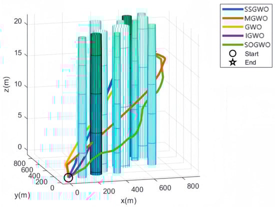 The GWO, MGWO, IGWO, SOGWO, and SSGWO algorithms were used for path planning and compared. The maximum number of iterations was 500, the initial number of wolves was 30, the simulation experiment was run 50 times, and the number of path nodes M was set to 30. In order to display the path effect more clearly, the three perspectives with the best results are shown in Figure 5, Figure 6 and Figure 7, with five paths in each figure, corresponding to the five different algorithms for UAV path planning under the same environmental constraints, showing a comparison of the path planning trajectories of the five algorithms in the three-dimensional environment. Figure 8 shows the path top view, and Table 4 records the flight records of the UAV, where pitch represents the average pitch angle of the M nodes on the path, yaw represents the average yaw angle difference between two adjacent nodes among the M nodes on the path, and dis-to-obs represents the average distance between the current node and the nearest obstacle among M nodes on the path.