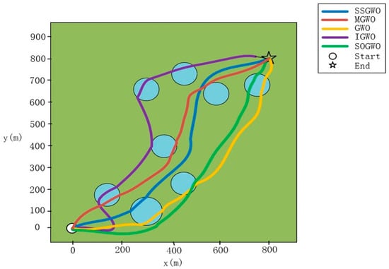 In order to verify the performance of the SSGWO algorithm, this study simulated the flight environment for UAVs in field vegetation areas. The SSGWO algorithm was applied to UAV path planning for verification analysis, and the path was smoothed through the B-spline curve. The size of the flight space was 800 × 800 × 20, and the starting point and end point were [0, 0, 0] and [800, 800, 15], respectively. The cylindrical obstacles and obstacle information are shown in Table 3.