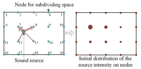 Figure 1, to simulate the sound field in the room, the intensity of the source is decomposed and spread over the nodes to form an initial distribution of the intensity in the element-free method.