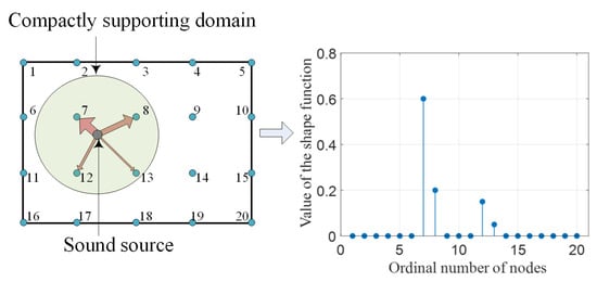 In Equation (7), the unknown vector to be determined is x, which contains the position of the sound source, and the aforementioned theory indicates that x is actually governed by the shape function of the sound source. Moreover, based on the compactly supporting domain for constructing the shape function, x has only a tiny number of non-zero elements. Therefore, x can be considered as a sparse vector, so the sparse recovery theory can be suitably used here.