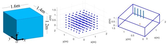 Figure 3. The center of the array is located at [1.5, 1.1, 0.5] m and the sound source at [0.60, 0.55, 0.48] m. The sound pressure sampled by the sensors is simulated using the modal superposition method based on normal modes. The density of air is