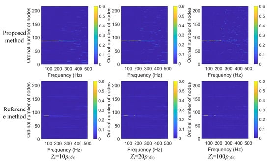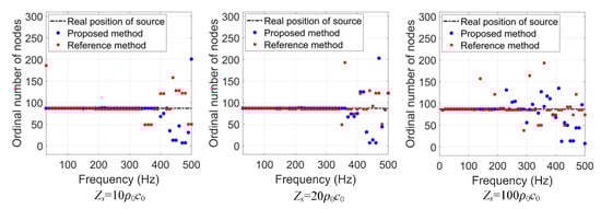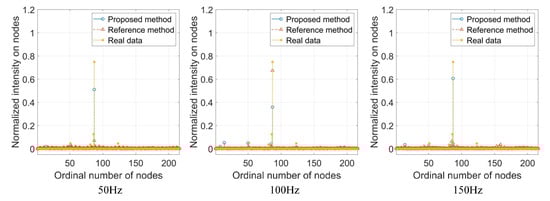 Figure 5 also shows that the proposed method’s recovered results are very similar with the real data, showing clearly that the source is located at the position of node 87. The reference method also gives correct results at 50 Hz and 100 Hz but has a tiny error at 150 Hz. It also shows that the proposed method gives robust low sidelobes at all three frequencies, whereas the reference method gives low sidelobes at 100 Hz but fails to do so at 50 Hz and 150 Hz.