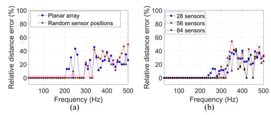 Figure 9 by varying the number of sensors. The results, obtained by averaging 50 independent trials with random sensor positions, showed that increasing the number of sensors is an effective method for enhancing the performance of the proposed approach. This improvement is evidenced by an increase in the upper frequency limit and a reduction in the relative distance error.