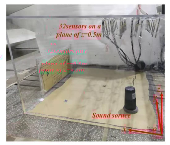 in size and made of acrylic plate, and its absorption coefficient was approximately 0.01. A speaker was placed at [0.2, 0.2, 0] m and played white noise, and there were 32 sensors near the top surface as illustrated in