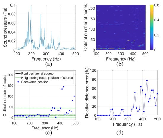 Figure 11 demonstrates that the sampled signal contained obvious noise and, under this condition, the proposed method was less stable than in the numerical verifications. However, it still gave a correct result at most frequencies below 340 Hz. The incorrect results at some frequencies were nevertheless on the node next to the exact position. The recovered intensity distribution shows that the proposed method yielded low sidelobes at most frequencies, and this proves that the proposed method is effective in a real environment.