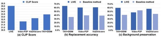 Quantitative results. (1) CLIP score: To evaluate the text–video alignment, we choose the setting of Imagen Video [3] to calculate the CLIP score [44]. We first calculated at the frame level the CLIP scores of four methods and then calculated the average value of the calculated CLIP scores for each method and took the average value as the CLIP score of the method. As shown in Figure 5a, the CLIP score of LIVE is the highest of all the methods, demonstrating that our method possesses better text–video alignment. (2) User study: We further evaluate LIVE and the baseline methods based on a user study. The questionnaire includes five videos, each of which has been edited using three kinds of baseline methods and our LIVE. For each video, there are two questions. The first is which method best preserves the input image after having completed video editing? The second is which method has the best-preserved background after having completed video editing? The two questions correspond to the two challenges of our proposed image-driven video editing task, which are how to achieve accurate object replacement and video coherence. Since Paint-by-Example is an image-based inpainting method, comparing it with other methods on quantitative metrics, like background preservation and similarity, to the input image is obviously unfair. Therefore, we did not present the quantitative results of this method. As shown in Figure 5b,c, the majority of the participants agree that our LIVE method can more accurately replace objects than any other baseline methods. For background preservation, our LIVE method beat other baseline methods, except for the Video-P2P method, because the Video-P2P method utilizes null-text inversion and delicately devises an attention control mechanism to achieve better preservation results. Therefore, the user study confirms that our LIVE method performs much better than other baseline methods in object replacement.