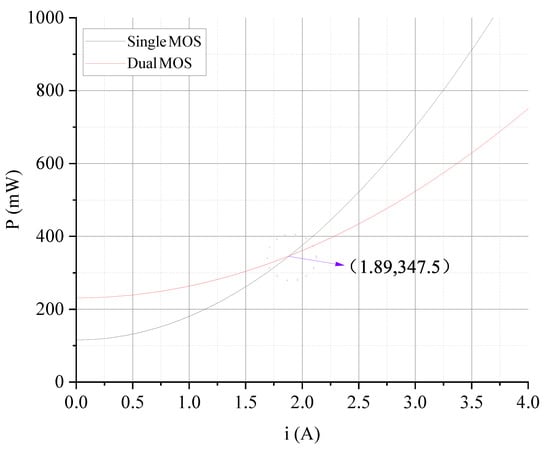 Referring to the previous equations for the driving and conduction losses of power MOSFETs and the relevant parameters of the prototype, we plotted the total power consumption of the driving and conduction losses of the single-MOSFET and dual-MOS operating states at 100 KHz (Figure 2) and looked for the root-mean-square currents when the power consumption of the two modes was equal to determine the state-switching point.