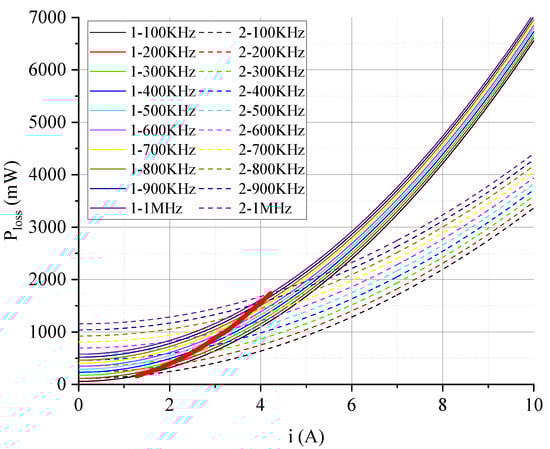 The sum of the driving and conduction losses at different frequencies under different loads.