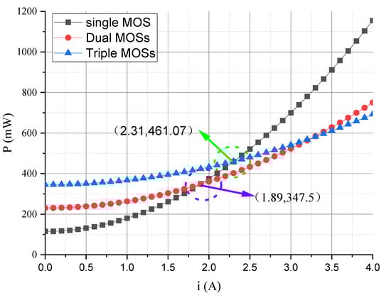 To minimize the total conduction and driving losses, the strategy divided the mode of operation into those of single MOS, dual-MOSs, and triple-MOSs in hierarchical driving applications with three parallel MOSFETs. The design of the switching points of the three parallel MOSFETs at 200 KHz is shown in Figure 4. The effective range of the hierarchical driving strategy increased with the increase in the number of parallel MOSFETs.