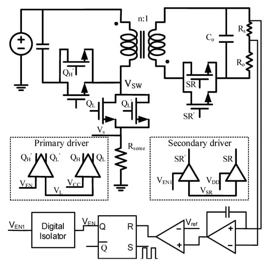 Here, and are the parallel high-end MOSFETs on the primary side, and and are the parallel low-end MOSFETs on the primary side. and are the parallel synchronous rectification MOSFETs on the secondary side. is the driver of and , is the driver of and , is the driver of , and is the driver of . , , , , and represent the first set of MOSFETs and drivers. , , , , and represent the second set of MOSFETs and drivers. represents the sense resistor for monitoring the output current. is the enable signal of the driver2, and is the enable signal of driverSR2.