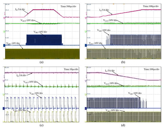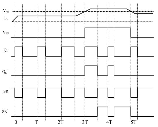 In the current detection scheme, a stable output current produced a stable voltage drop across . The converter’s output current was generally stable and only fluctuated when the load was switched. A schematic of the operating waveform in the current detection strategy is shown in Figure 6.