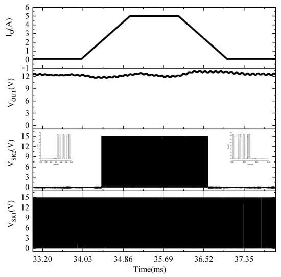 From the simulation results, it can be seen that at 34.01 ms, the load current started to rise from 0.1 A to 5 A with a slope of 50 A/ms; the load current was maintained at 5 A for 1 ms, and then it started to fall to 0.1 A with a slope of 50 A/ms. The whole process of the variation in the load current was maintained for 3 ms. During this process, the range of fluctuation in the output voltage was 0.5 V, which met the design requirements. During the whole working process, the synchronous rectifier driver of the first set, , always maintained a normal output. When the load current reached 1.9 A, the synchronous rectifier driver of the second set, , started to enable the output. The specific waveform of the output-enabling process is shown in the upper-left corner of the figure (), and the output-disabling process is shown in the upper-right sub-figure. When the load current dropped from 5 A to 2.1 A, stopped outputting, which was mainly caused by the inconsistency between the turn-on and turn-off voltages of the driver’s enabler.