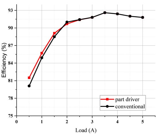 Graphs of the efficiency tests on the two converters are shown in Figure 10. According to these graphs, it can be seen that in the light-load state—especially with a load current in the range of 0.5–1.5 A—the control scheme proposed in this study effectively improved the efficiency of the converter; the most obvious effect was at 0.5 A, where the efficiency improvement reached 1.4%. With the increase in the load current, the loss brought about by the drive accounted for a smaller and smaller proportion of the total loss, so the efficiency improvement became smaller and smaller. When the load current was 2 A, the control scheme proposed in this study lost its effect on the improvement in efficiency, and the efficiency of the traditional parallel-drive converter was slightly higher than that of this experimental scheme, which was mainly caused by the additional control losses brought about by it. With the further increase in the load, the proportion of the extra loss introduced in the total loss became smaller and smaller, and the efficiency of the two schemes was almost equal.