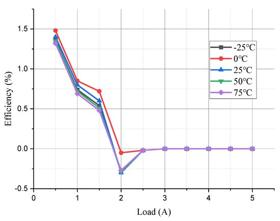 The real-world challenges of manufacturing variations and environmental factors must be considered. To reduce the power loss of the sense resistor, the gain of the current sense amplifier needed to be large enough. Manufacturing deviations in the sampling resistor and temperature coefficients of the current sense amplifier can cause a shift in the switching point of the hierarchical driving control strategy, which has an impact on the maximum gain of efficiency with the hierarchical driving control method. The efficiency improvement of this strategy was tested at different temperatures, and the test results are shown in Figure 11. This strategy worked effectively in the range from −25 °C to 75 °C. There were small fluctuations in the efficiency improvement at different operating temperatures, which were affected by the temperature characteristics of the key devices, such as the SiC MOSFET, the current sense amplifier, and the sense resistor.