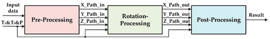 This paper introduces an FPGA-based floating-point CORDIC processor as the DUT, composed of pre-processing units, rotation-processing units, and post-processing units. The top-level structure of the floating-point CORDIC processor is depicted in Figure 2. Internal circuits of each unit in the design achieve maximum reuse, with top-level configuration handling input signals, coordinate systems, and rotation modes to enable different operations. In this design, 2-bit signals T0 and T1 are employed to represent the coordinate system, and a 1-bit signal P represents the rotation mode. In the practical implementation, T0, T1, and P can be combined into a single 3-bit signal, which is input into various units of the floating-point CORDIC processor. Specifically, pre-processing mainly includes input registers, mathematical transformations, and data formatting. Rotation-processing mainly involves shift operations, iteration processes, and corresponding control logic. Post-processing includes quadrant recovery, output rounding, and output registers.