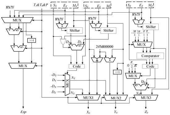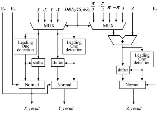 This module implements quadrant recovery for trigonometric functions and other operations for fixed-point to floating-point conversion. We set a 1-bit signal, where D = 0 represents trigonometric operations and D = 1 represents the other three operations. The quadrant recovery is performed based on the encoding signals S2, S1, and S0 collected by the pre-processing module, as shown in Table 3. Then, the exponent section is normalized, and the mantissa section is determined. After concatenating them, the result is output as a floating-point number. The final output results are represented as X_result, Y_result, and Z_result. The hardware structure is shown in Figure 5.
