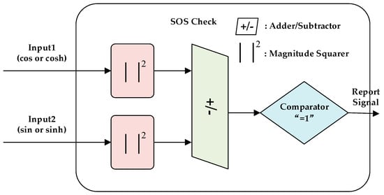 The conventional approach for managing fault tolerance or self-healing in literature typically relies on redundancy or replication []. These methods require significant resource consumption, which may be deemed unacceptable given certain constraints. ABFT methods such as SoS are often used in DSP circuits []. For the CORDIC processor, Figure 7 presents a feasible architecture of the SoS check.