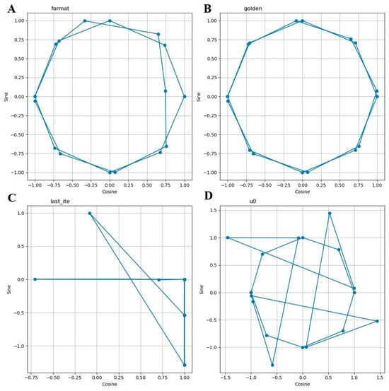 Output data of the CORDIC processor with different fault states. (A) Pre-processing fault state; (B) error-free state; (C) post-processing fault state; (D) rotation-processing fault state.