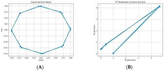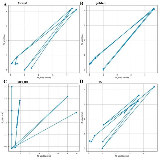 Figure 11 shows a set of output data after FFT with different fault states. (A) represents the result of the pre-processing fault state, (B) represents the error-free state, (C) represents the post-processing fault state, and (D) represents the rotation-processing fault state. Compared with Figure 9, we can observe and draw the following conclusion: For the output sine/cosine values of CORDIC processing, the main features of fault characteristic signals can be effectively extracted through FFT. This method increases the inter-class difference and reduces the intra-class difference, which can contribute to CNNs training.