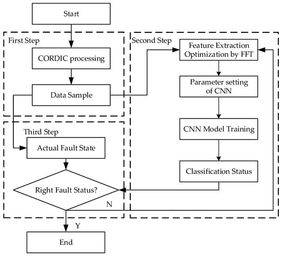 After the first step of fault injection and CORDIC processing, the data samples go through FFT preprocessing to obtain data features in the frequency domain. In the second step, the output of the FFT is passed to the CNN, which performs feature extraction and learning steps after setting appropriate parameters. Then, there is the classification process, which is used to determine the fault state. Finally, in the third step, the predicted fault state is compared with the actual fault state. If the predicted fault matches the actual fault, the training stops. Otherwise, feedback on the results is sent back to the FFT and preprocessing stage to update the relevant parameters for more accurate learning. This iterative process continues until the predicted fault state matches the actual fault state. In the testing stage, new data are subjected to FFT transformation, and the FFT result is sent to the CNN-based classification model to perform its role, completing the entire fault diagnosis process and providing the final classification decision for the fault.