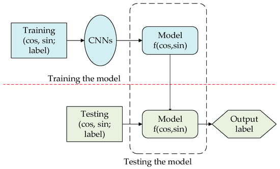 The training and testing model are shown in Figure 15. The process is divided into two stages: training and testing. In the training stage, the input cosine and sine values, along with their corresponding fault labels, are applied to train the neural network, to establish a model Function f(cos, sin) for the input data. This model is then used to test future inputs during the testing stage. In the testing stage, new inputs are used to test the model and validate its operation. The model provides corresponding outputs, i.e., fault categories, for the inputs. The FFT preprocessing is applied to the neural network for training. In the training cases, the neural network learns patterns of different fault shapes and presents this training process as a model. A model consists of assumptions formed based on the input data to classify the outputs during the testing stage. Testing is the next step after completing the training, where new inputs are tested. In the testing cases, the inputs undergo FFT preprocessing first and then the network is tested using the results. The fault classification dataset is applied to the neural network using the model constructed in the training stage to obtain classification and diagnosis results.