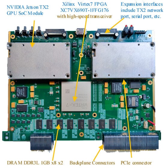 Xilinx Virtex7 FPGA XC7VX690T-1FFG176 and NVIDIA Jetson TX2 (Tegra X2 SoC module) were employed on the hardware platform [,]. Xilinx Virtex7 was equipped with high-speed transceivers. Jetson TX2 was equipped with Denver 2 and ARM Cortex-A57 CPUs in addition to a GPU. Figure 16 shows the hardware architecture of the whole fault-tolerant system implemented in this paper.
