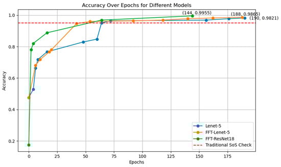 In order to better illustrate the performance improvement of the proposed FFT-CNN fault classification and diagnosis approach, we selected relevant data for visual comparison, including the traditional SoS check, Lenet-5, FFT-Lenet-5, and FFT-Resnet18, as shown in Figure 17. The results presented in the figure align with the conclusions mentioned above. The FFT-Resnet18 method, which demonstrated the best performance, can achieve an accuracy improvement of 4.55% over the traditional SoS method. To be more specific, the accuracy of the FFT-Resnet18 method was 99.55%, while the accuracy of the traditional SoS method was 95%.