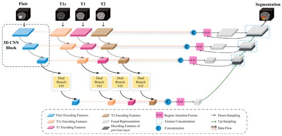 - Peiris, H.; Hayat, M.; Chen, Z.; Egan, G.; Harandi, M. A robust volumetric transformer for accurate 3d tumor segmentation. In Medical Image Computing and Computer Assisted Intervention–MICCAI 2022, Proceedings of the 25th International Conference, Singapore, 18–22 September 2022, Proceedings, Part V; Springer: Cham, Switzerland, 2022; pp. 162–172. [Google Scholar]