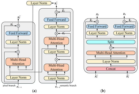 Formally, for the input feature () of the -th block, we define the input of the pixel branch as , the input of the semantic branch as (), the output of the pixel branch as , and the output of the semantic branch as . The specific expression for the semantic branch is as follows: