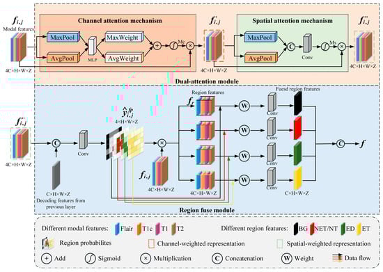 As shown in Figure 3, we propose the region–attention fusion module (RAF) to combine the most important features of different modalities. RAF first divides the images of different modalities into different target regions, which is the most important step in the whole fusion process. Specifically, the target region is divided into the background region (BG), edema region (ED), enhancing tumor region (ET), and non-enhancing tumor/gangrenous region (NET/NT). Under the supervision of ground truth, the channel and spatial attention mechanisms are used to precisely divide these regions. The channel attention focuses on the channels that are important in the input feature map, while the spatial attention focuses on the useful pixel regions. Introducing the attention mechanism in these two dimensions helps improve the learning accuracy of region probability, which is important for the subsequent region division task. Then, the output of the dual-attention module is put into the region fusion module. The module concatenates it and the features from the previous layer (except the last layer) in the decoder. After that, the probabilities of target regions are learned under the supervision of ground truth. The input feature maps are divided into different regions by element-wise multiplication with region probabilities.