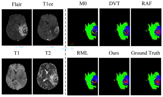 The baseline used 3 × 3 × 3 convolutions to extract and aggregate the image features from four modalities. The loss function consists of weighted cross-entropy loss and Dice loss. On the BraTS2020 dataset, compared with the baseline model, the Dice increased by 3.55%, 5.99%, and 3.15% in three tumor regions, respectively. And the Hausdorff distances decreased by 8.137 mm, 8.736 mm, and 5.814 mm, respectively. It can be seen that the modules we designed are effective for brain tumor segmentation tasks. With the introduction of our DVT, the results of three evaluation metrics have improved. This is because DVT can better model the long-distance dependencies and fully combine local features and global information. With the RAF module, regions in the TC and ET obtained higher Dice scores. This demonstrates that our region–attention fusion module can fully utilize the characteristics of different modalities, resulting in the accurate classification of relevant tumor regions. The combination of RML and RAF reduced the Hausdorff distance of three tumor regions. It is because RML punishes each voxel based on the distance to the boundary, which improves the accuracy of the fusion results.