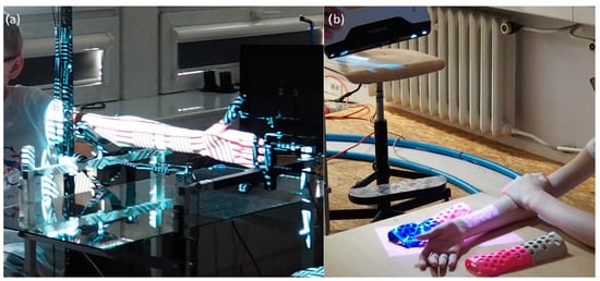 The main concept of the therapeutic orthosis in this case was based on 3D anatomical scans of both arms of the patient. Both limbs were scanned; the healthy left arm was scanned in an anatomically correct position at the AutoMedPrint scanning station using David SLS-3 scanner (HP Inc., Palo Alto, CA, USA) (Figure 4a), while the right arm was scanned manually, using EinScan Pro 3D scanner (Shining 3D, Hangzhou, China), with a wrist position comfortable to the patient (Figure 4b). Both scanned meshes were split at the wrist; healthy left hand was digitally “transplanted” (and mirrored) to the right forearm, and properly scaled using main dimensions from the scan of the right hand.