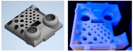 For easy mounting of the controller at users’ hands, it was decided to build an external housing, easily attachable and detachable from the orthosis main shell. The housing, due to increased demand for accurate dimensions, was manufactured using PolyJet technology. Stratasys MediJet J5 (Stratasys Co., Waltham, MA, USA) machine was used with a standard DraftWhite material (UV resin), with layer thickness of 18 µm. Design of this housing and its manufacturing is shown in Figure 8.