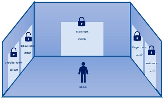 The next stage was to design the VR application for therapeutic purpose itself. To do this, it was necessary to determine the type of game and create a suitable scenario in VR for it. The type chosen was specified as an escape room. For this, it was necessary to consult a specialist (physiotherapist) to choose the appropriate exercises and design their implementation in the game. The created scenario for the game assumed the making of four rooms, in which the user would focus on movements within a specific joint—successively, the shoulder, elbow, wrist, and finger joints (an idea diagram of the initial space can be seen in Figure 9). Even before exercising, a warm-up of the whole body would be performed by a simple game forcing the user to avoid flying obstacles by leaning, crouching and jumping.