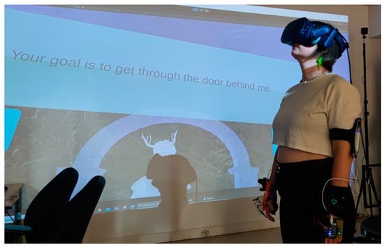 The users were tested under laboratory conditions, using HTC Vive Pro headset connected via cable to a PC with the application. The customized controllers were used on both hands, with the right hand equipped in the 3D-printed orthosis and the left hand equipped with the prototype controller itself (auxiliary, to help realize activities requiring two hands). A user during the tests is presented in Figure 10.