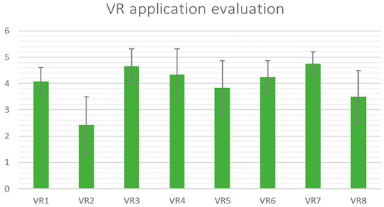 - Part 1—evaluation of VR application and exercises, 8 questions, Likert scale (1–5),