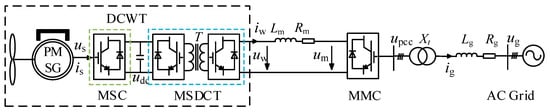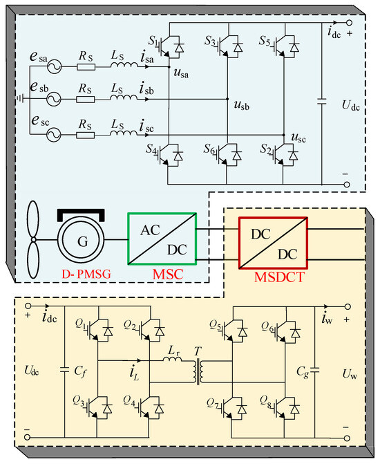 The DCWT topology is depicted in Figure 2. The DCWT comprises an MSC and an MSDCT, with the MSC connected in series with the MSDCT. All fully controlled devices are utilized in both the MSC and MSDCT. A DC link is present between the MSC and MSDCT. As part of a demonstration system, the first international ±30 kV/5 MW WDCG demonstration project is set to be established in Xinjiang.