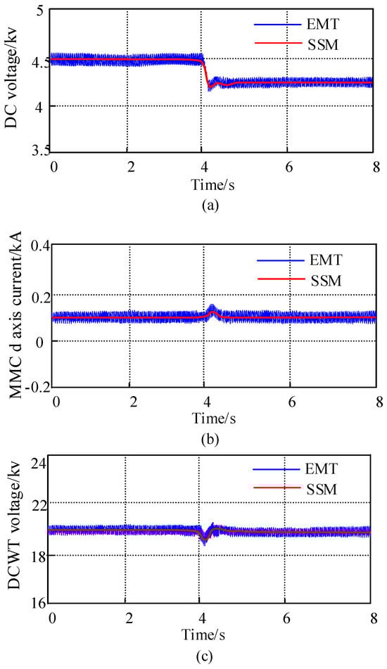 Figure 4a–c showcases the dynamic responses of the DC voltage, d-axis current of MMC, and DCWT voltage following the step-change in the MSDCT voltage reference. It is evident from Figure 4 that the dynamic responses obtained from the small-signal model align with those from EMT simulations, thereby affirming the accuracy of the developed small-signal model.